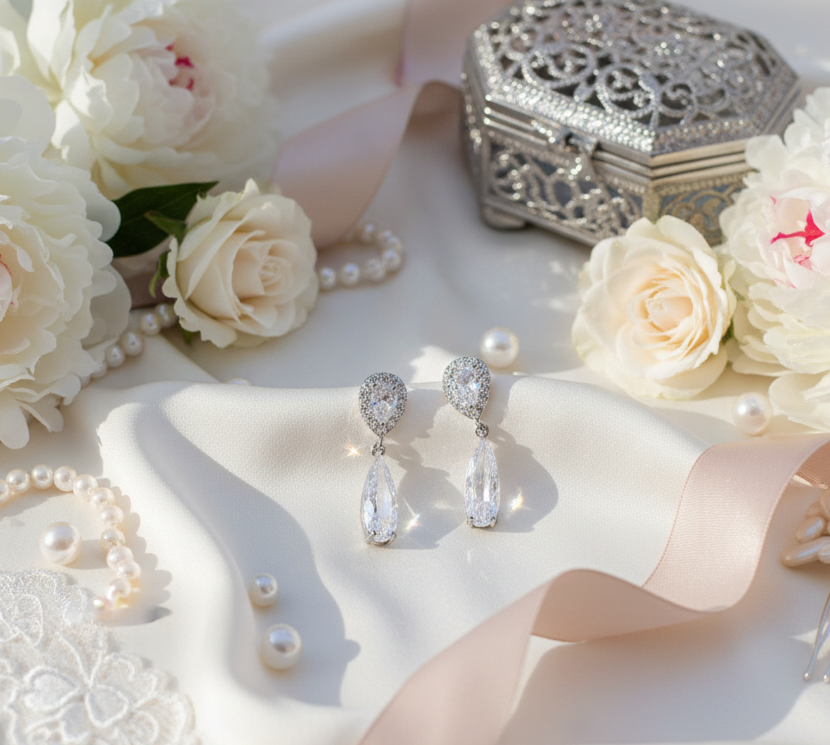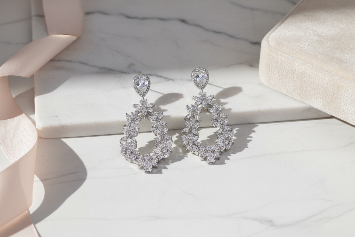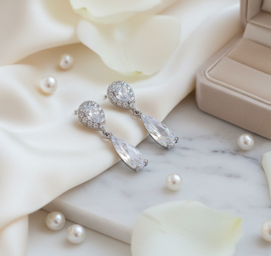 Boucles Pendantes de Mariage en Zircons et Perles Goutte - Collection Élégance